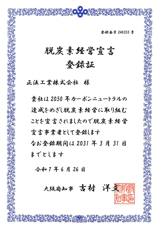 脱炭素経営に取組む事業者を⽀援する⼤阪府の「脱炭素経営宣⾔登録制度」に賛同し、